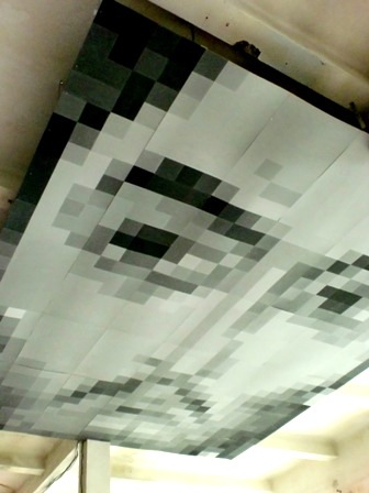 Irina and Vadim Grabkov (Ирина и Вадим Грабковы) are a Moscow brother-sister art duo. Their infamous grayscale pixilated paintings of paparazzi shots and porn screen captures summarize the age of overinformation and instant fame. For this biennale they created a large scale version of Jesus. More examples can be found here and on their Live Journal page.