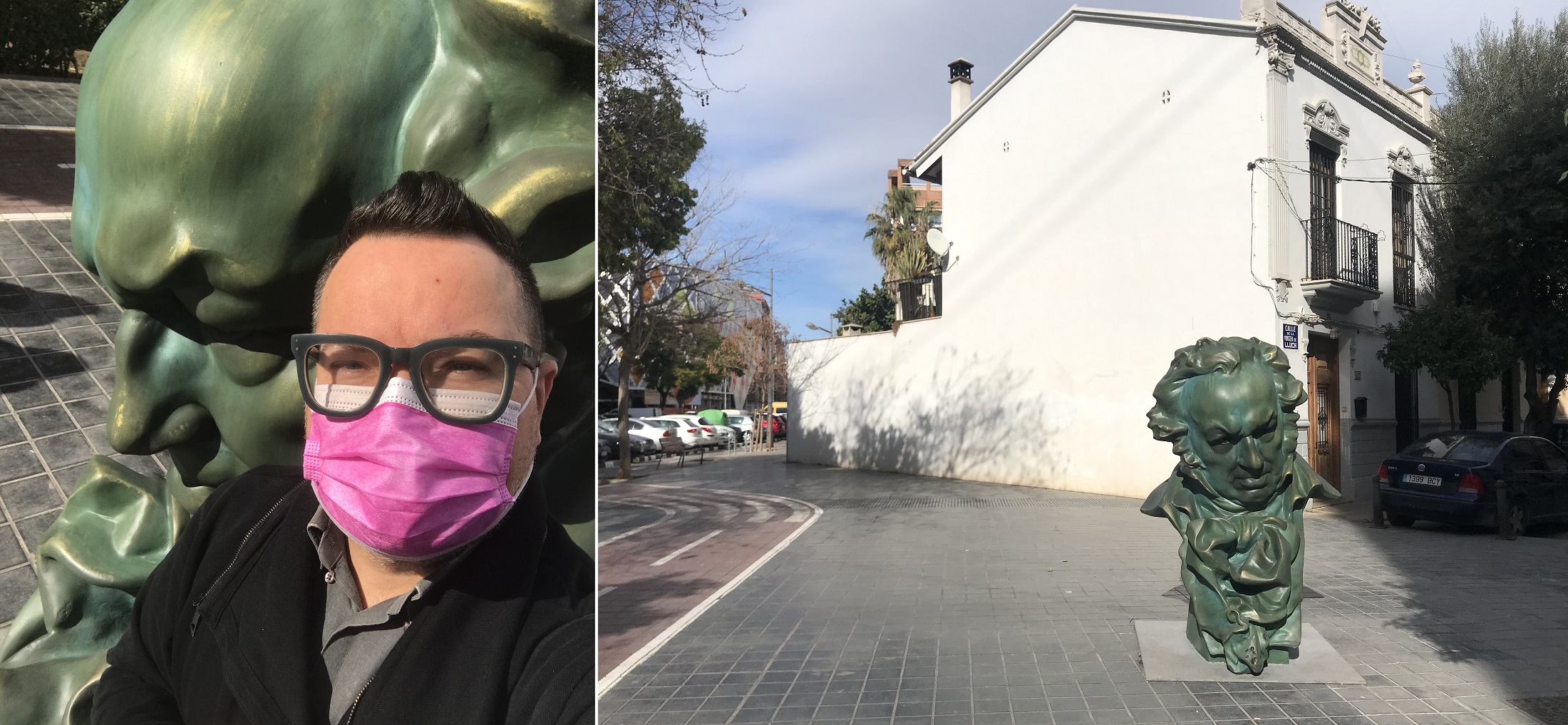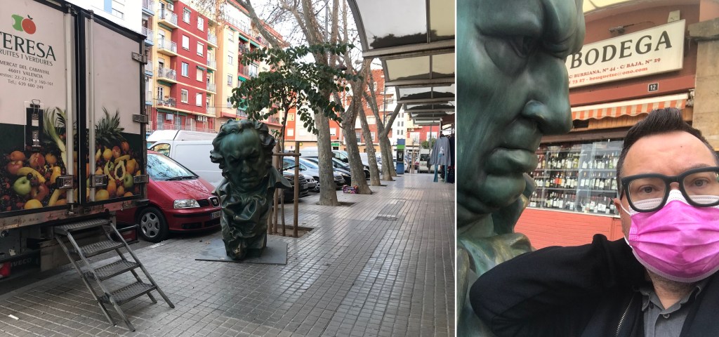 Two days before Valentine’s Day (*) Valencia hosted the 36th GOYA Awards of/for the Spanish film lovers. I reviewed the nominees for PostParis.com and my frontrunner – Mediterráneo – won in three categories. In the weeks leading up to the ceremony, 12 statues of Francisco Goya’s bust (a replica of the award) were placed around the city to encourage social engagement and interest in cinema. For #TimbulWalksValencia pilgrimage, I dedicated a splendid afternoon to visit all 12 sites. I got the map and set off to check out the different neighborhoods and practice my drama/comedia face behind the mask 🙂 I never got into Pokémon GO, but I was like … Gotta catch ’em all!